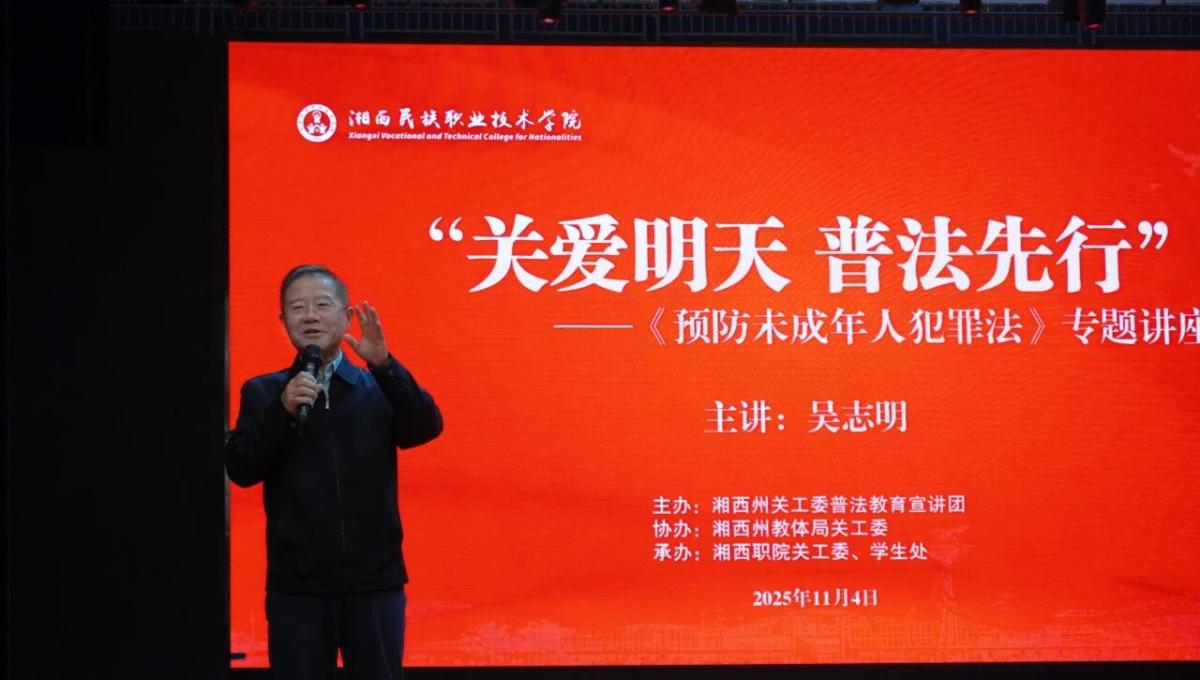 讲座特邀湘西州政协原副主席、州人民检察院原副检察长、州关工委普法教育宣讲团副团长吴志明同志担任主讲。他系统解读了《预防未成年人犯罪法》,凭借其深厚的法学功底和丰富的实践经验,运用详实的数据与生动的案例,深入浅出地阐明了法律的重要性和严肃性。吴志明强调,未成年人身份绝不是违法犯罪的“护身符”,呼吁同学们不仅要学好专业知识与技能,更应主动学法、积极知法、努力懂法、严格守法,树立正确的法治观念。