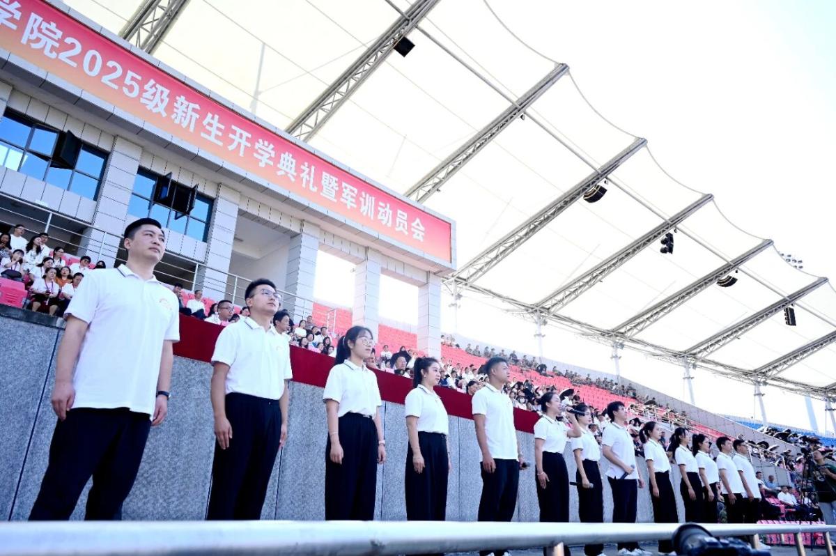 典礼在庄严的国歌声中正式启幕。国旗护卫队步伐铿锵,五星红旗冉冉升起,全场师生肃立注视,齐声高唱国歌。